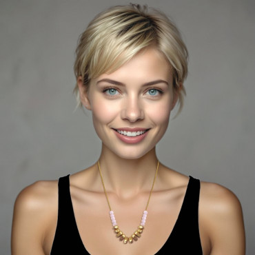 ❤ Necklace designed with ten asymmetrical matte metal beads and light pink crystals combined with a gold-colored stainless steel chain